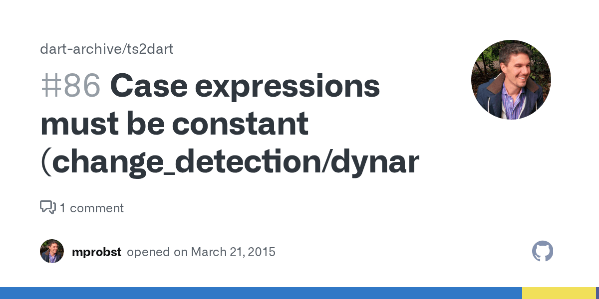 The case expression must be unique. Constants are values that can't change after beeing assigned, which means any final value is a constant. Unless you put a break after each block of code, the execution flows into the next block. The case expression must be unique. Try making the argument a valid constant, or use 'new' to call the constructor. "case expressions must be constant expressions". Jul 17, 2019 · the switch case expressions must be constants for sure. You cannot use arguments from the surrounding function in a switch case.. What you are trying to do here is not supported by the dart switch statement.